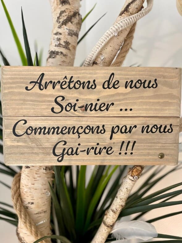 Arrêtons de nous soi-nier, commençons par nous gai-rire- Pancarte en bois message optimisme